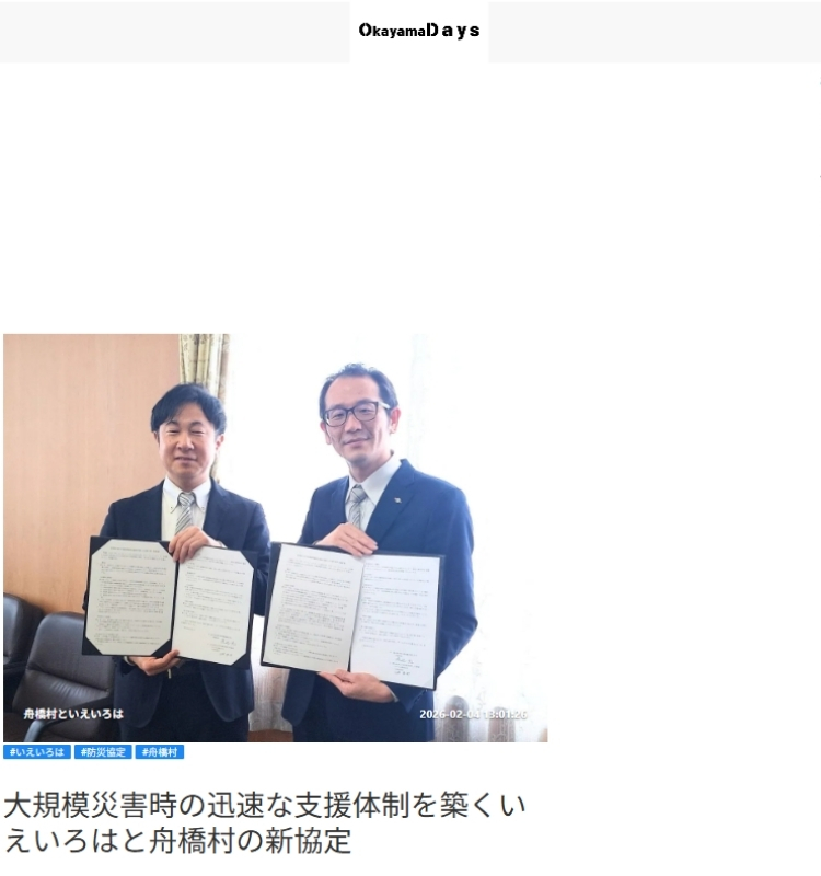 いえいろはの富山県舟橋村との災害時復旧協定がOkayama Days(岡山Daysニュース)で取り上げられました