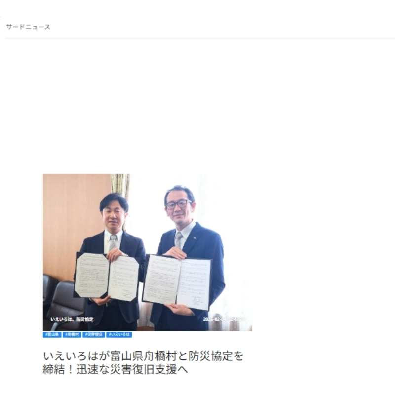 いえいろはの富山県舟橋村との災害時復旧協定がサードニュースで取り上げられました